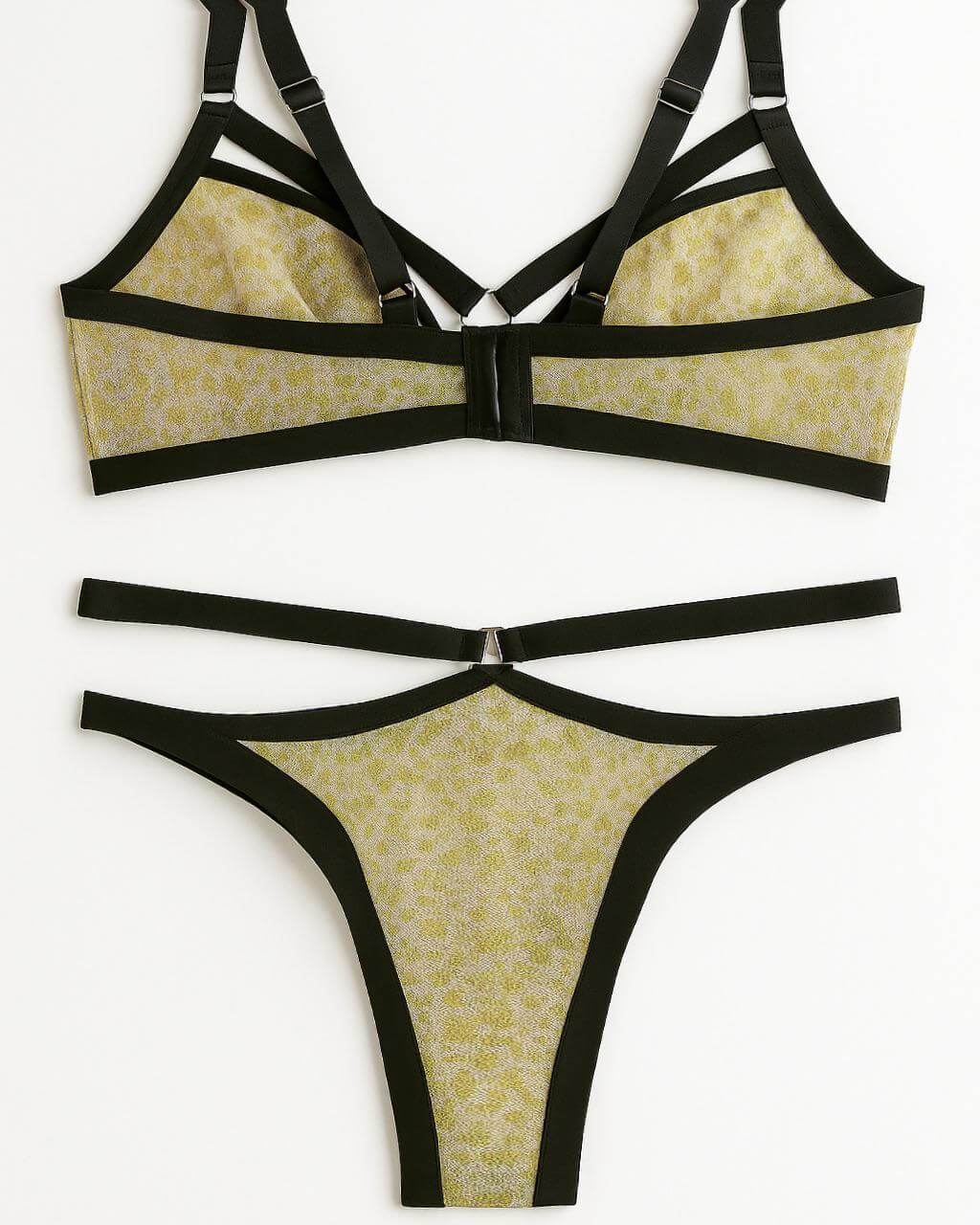 El sostén tiene copas con aros visibles y cortes verticales para dar forma y soporte. Las tiras decorativas sobre el escote se cruzan hacia el centro y se unen con un aro metálico, generando un efecto visual moderno. Los tirantes son ajustables para mayor comodidad.