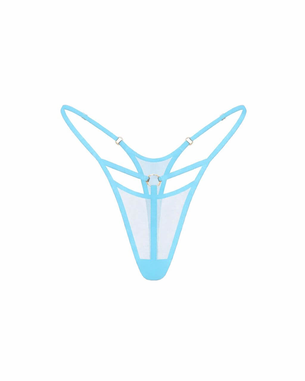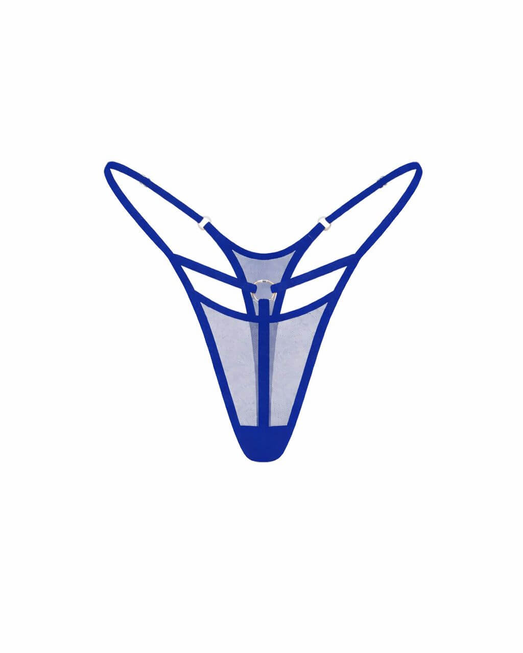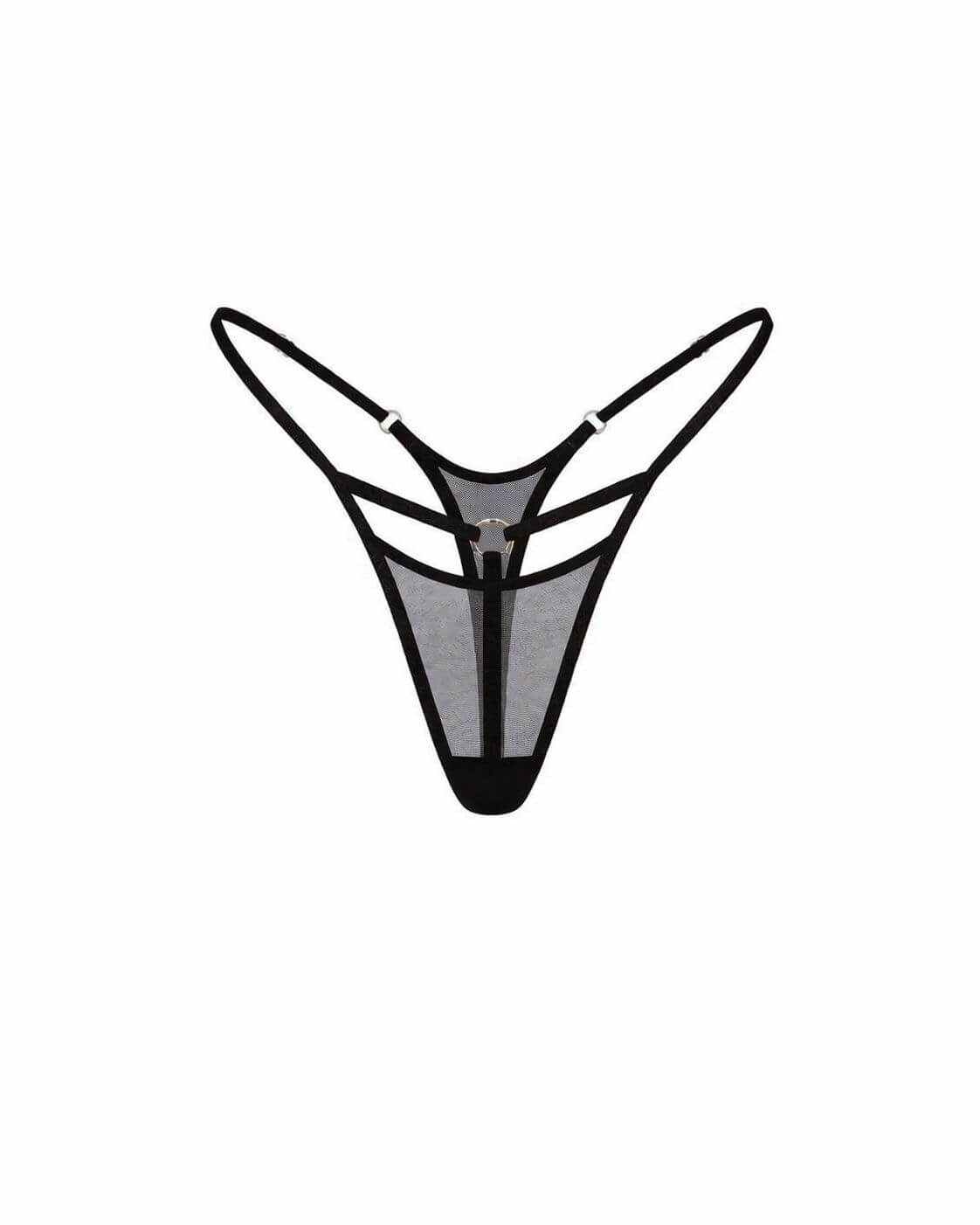 Este colaless se caracteriza por un diseño moderno y minimalista que combina sensualidad con estilo. Confeccionado en malla semitransparente de textura suave, presenta un corte tipo tanga de tiro medio. El detalle distintivo es una doble tira que se cruza en la parte superior, unida por un aro metálico central que aporta un toque sofisticado. Los bordes elásticos y los herrajes ajustables permiten un calce cómodo y adaptable al cuerpo. Ideal para complementar conjuntos de lencería contemporánea.