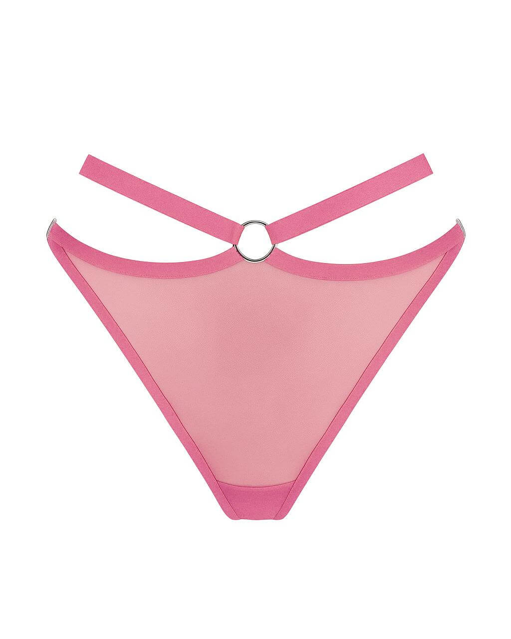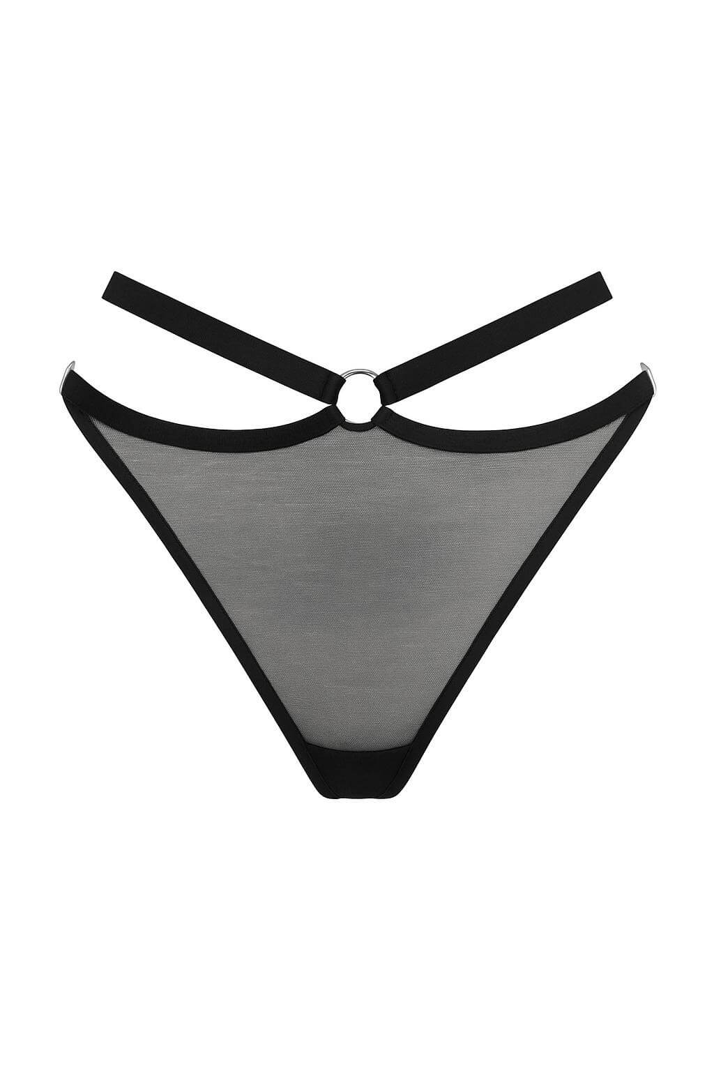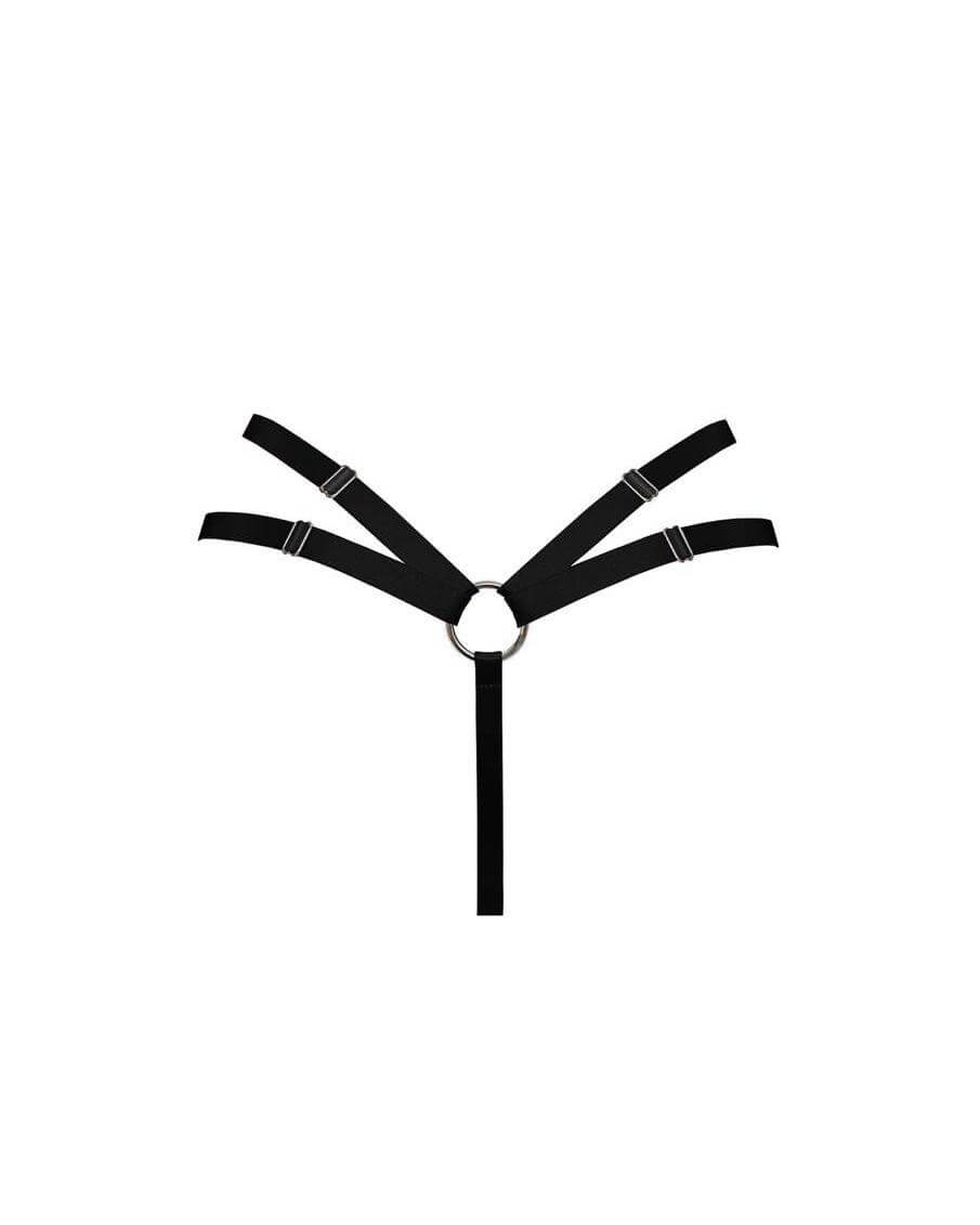 Este colaless se caracteriza por un diseño moderno y minimalista que combina sensualidad con estilo. Confeccionado en malla semitransparente de textura suave, presenta un corte tipo tanga de tiro medio. El detalle distintivo es una doble tira que se cruza en la parte superior, unida por un aro metálico central que aporta un toque sofisticado. Los bordes elásticos y los herrajes ajustables permiten un calce cómodo y adaptable al cuerpo. Ideal para complementar conjuntos de lencería contemporánea.