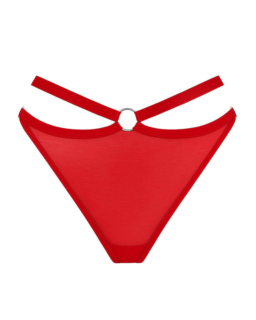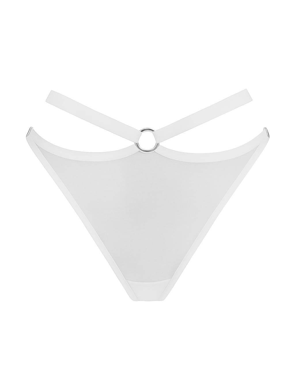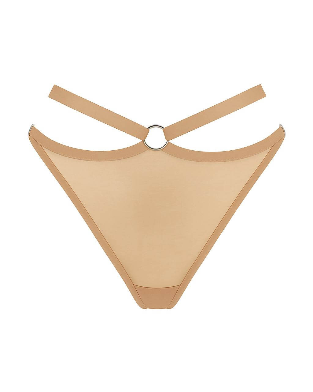 Este colaless se caracteriza por un diseño moderno y minimalista que combina sensualidad con estilo. Confeccionado en malla semitransparente de textura suave, presenta un corte tipo tanga de tiro medio. El detalle distintivo es una doble tira que se cruza en la parte superior, unida por un aro metálico central que aporta un toque sofisticado. Los bordes elásticos y los herrajes ajustables permiten un calce cómodo y adaptable al cuerpo. Ideal para complementar conjuntos de lencería contemporánea.